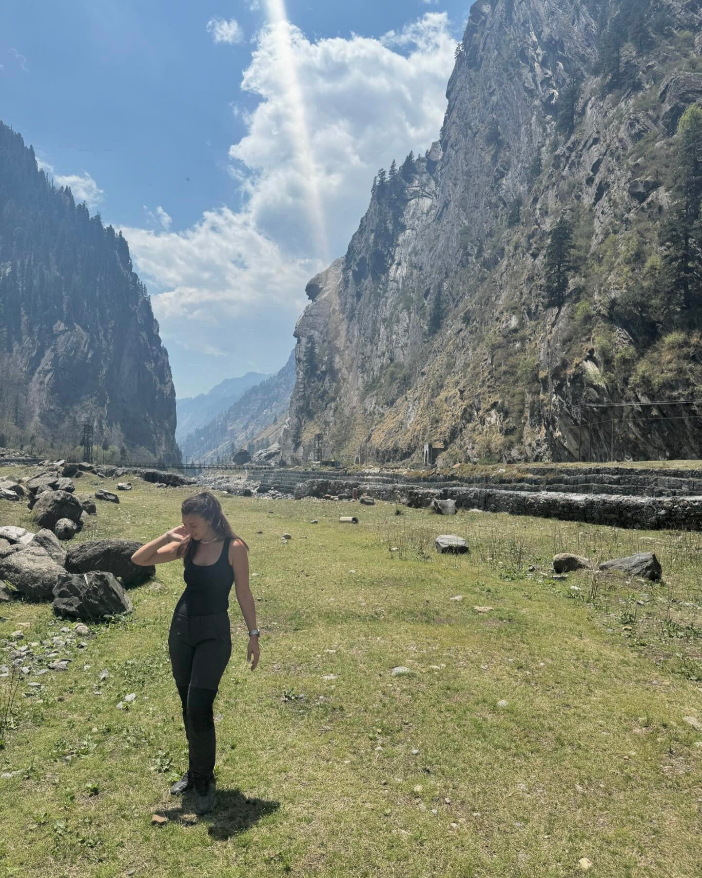 אישה לובשת תכשיטי Mella – שרשרת וצמידים מאבנים טבעיות, מצולמת באור טבעי מול דלת עץ, משדרת חיבור, נשיות ואנרגיה שקטה של יופי אמיתי.